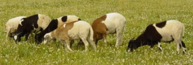 | Here are some shots of the ewe flock. I keep between 30 and 50 ewes, all of good color, so I can supply large numbers of lambs so buyers can get unrelated stock but still from the same good color producing line and get enough to justify transport costs. |